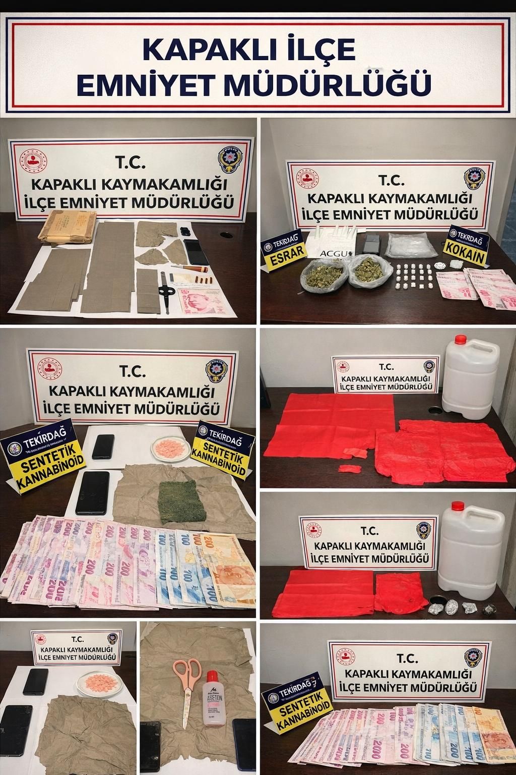 Kapaklı İlçe Emniyet Müdürlüğü ekipleri, narkotik suçlarla mücadelede geçen ay adeta suçlulara göz açtırmadı. İlçe genelinde yürütülen yoğun operasyonlarda binlerce uyuşturucu madde ve suçtan elde edildiği değerlendirilen yüklü miktarda para ele geçirildi. Gerçekleştirilen çalışmalarda yaklaşık 30 bin adet A.M. sıvısı emdirilmiş peçete, 258 gram esrar, 23 gram kokain, 2,85 gram metamfetamin, 46,03 gram amfetamin ham maddesi, 1 adet hassas terazi ile 66 bin 90 TL nakit para bulundu.