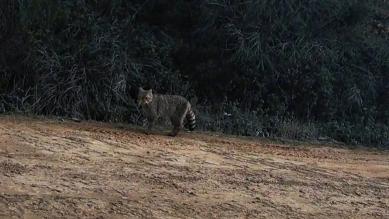 Türkiye’de nadir görülen türler arasında yer alan ve insanlardan uzak, sessiz bölgeleri tercih eden bir yaban kedisi, kameraların görüş açısına girdi. Görüntülerde, yaban kedisinin orman derinliklerinde temkinli adımlarla ilerlediği ve çevresini dikkatle kontrol ettikten sonra izini kaybettirdiği anlar net bir şekilde görüldü.